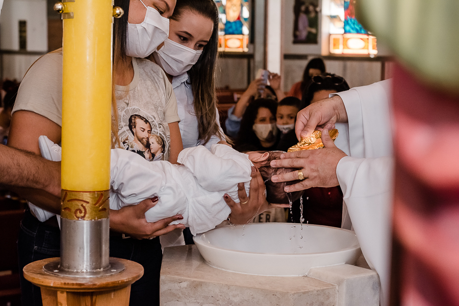 Após a missa na Paróquia Nossa Senhora de Aparecida na cidade de Mongaguá, estado de São Paulo, foi realizada a cerimônia do batismo. José estava calminho no colo do papai e recebeu do padre a unção com o óleo consagrado, simbolizando o Espírito Santo de Deus. Logo veio o momento tão esperado por todos, na pia batismal enquanto sua madrinha o segurava, o pequeno José Carlos recebeu a água sagrada em sua cabecinha, purificando sua vida. Chorou um pouquinho, mas logo se acalmou quando a mamãe secou seus cabelinhos. E por fim, seu padrinho acendeu a vela no Círio Pascal, simbolizando Cristo a luz do mundo, a luz que ilumina e protege o caminho do bebê ao receber o batismo.