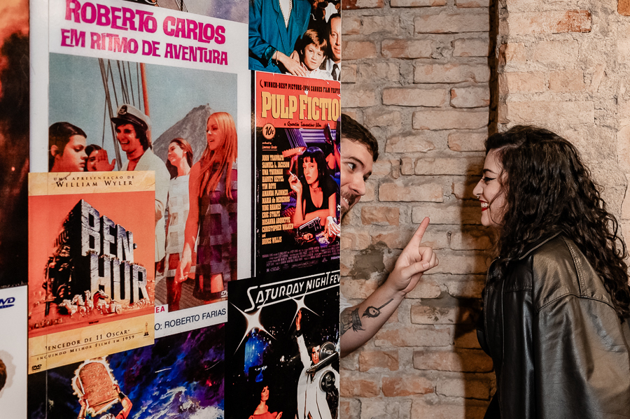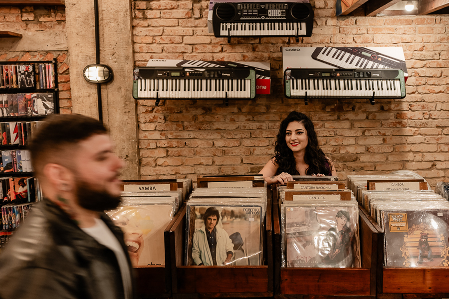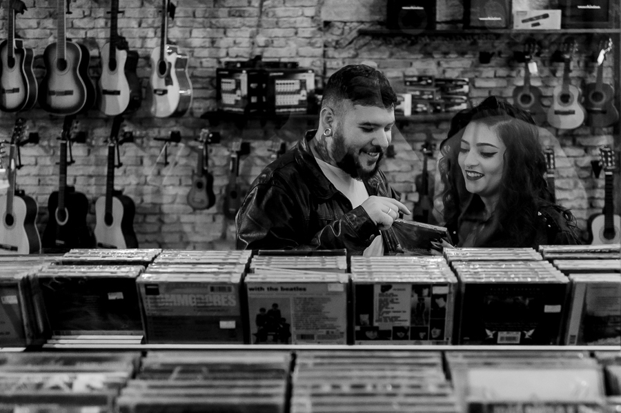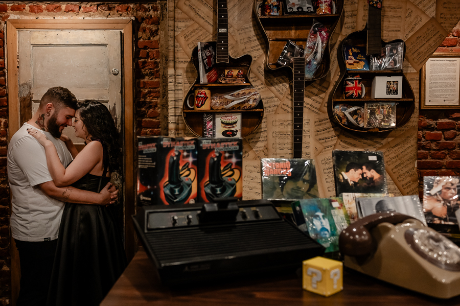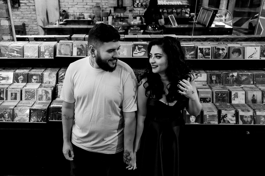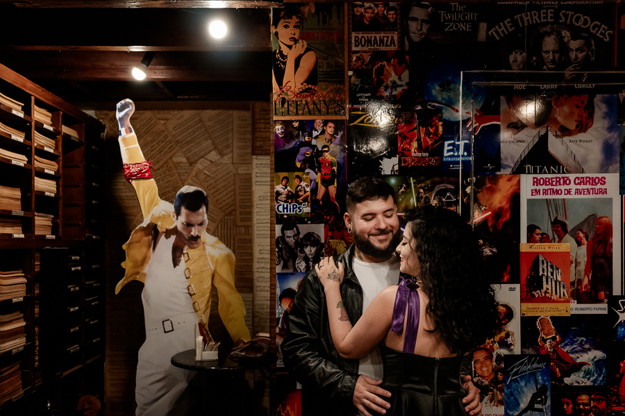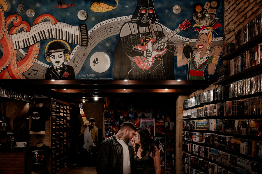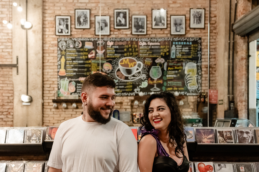Um casal apaixonado por música, café e cultura nerd. O local escolhido pela Yasmim e pelo Ariel foi A Musical, localizado em Santos-SP, onde eles sentem-se muito a vontade, já que o ambiente é retrô, com música, discos antigos, instrumentos e, claro, café!