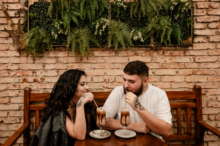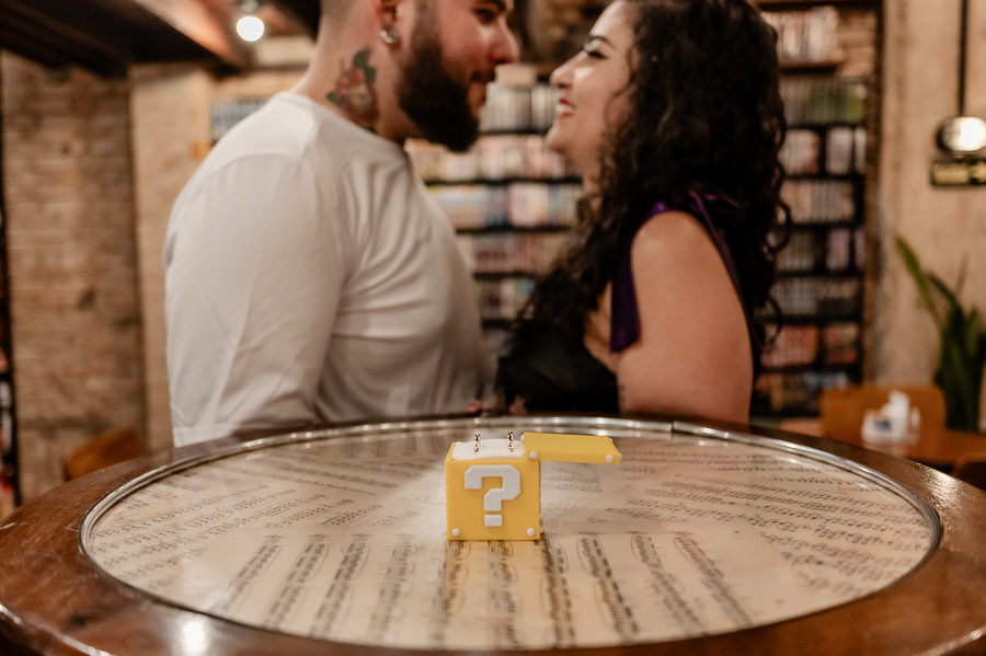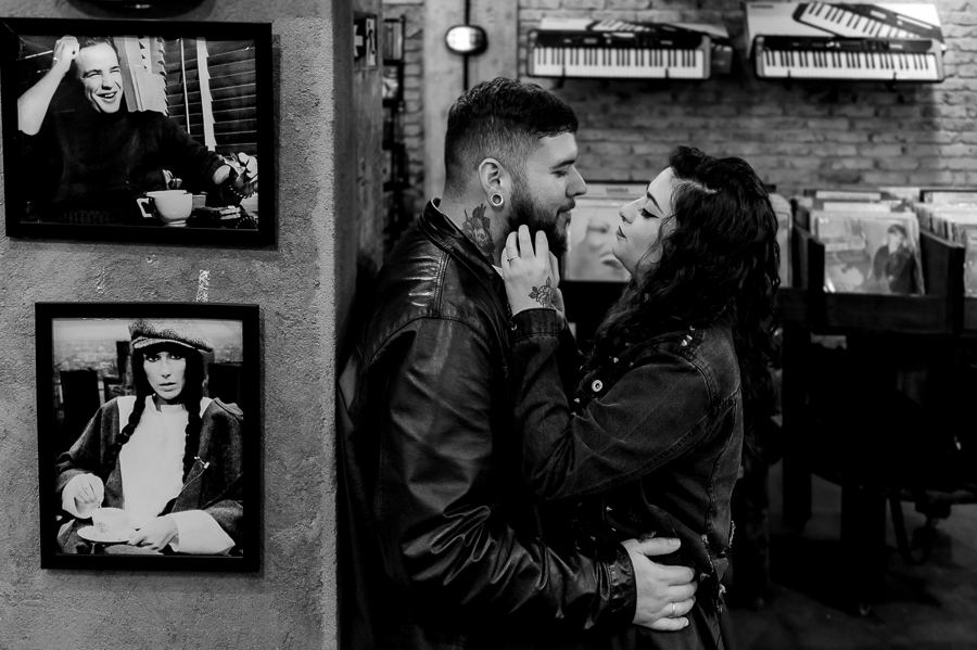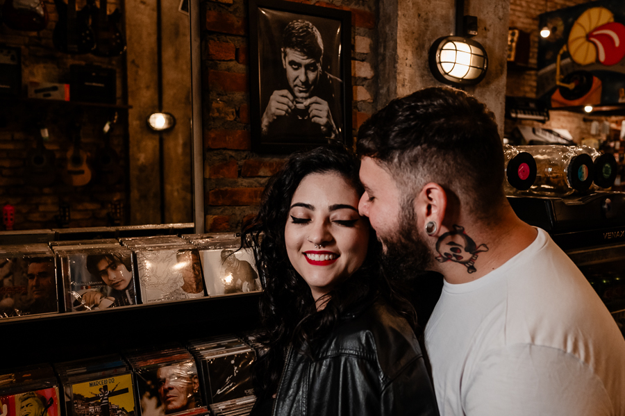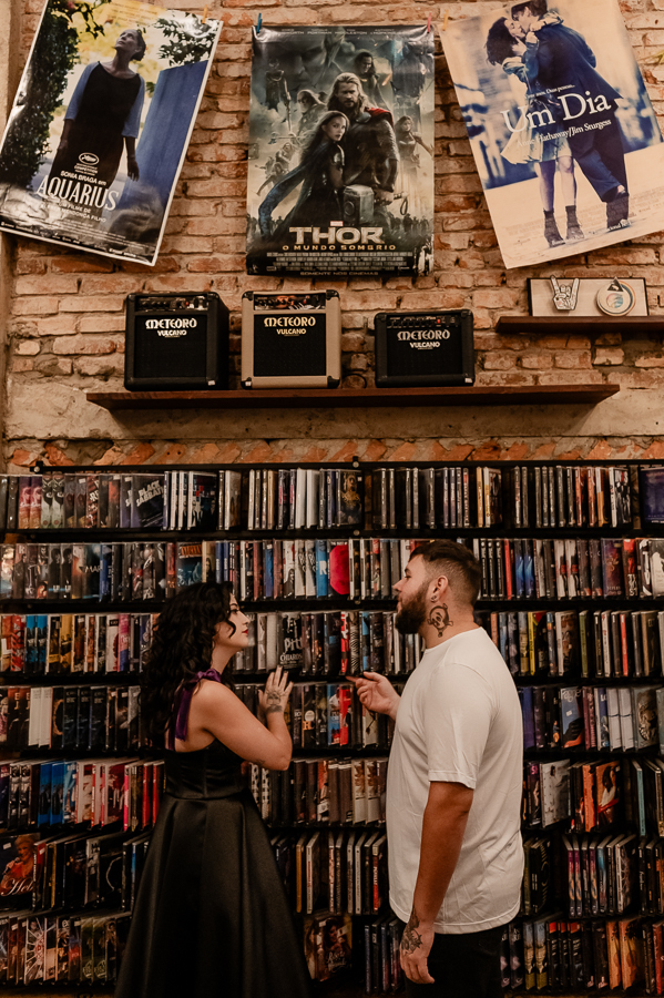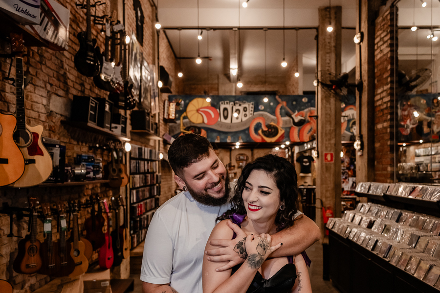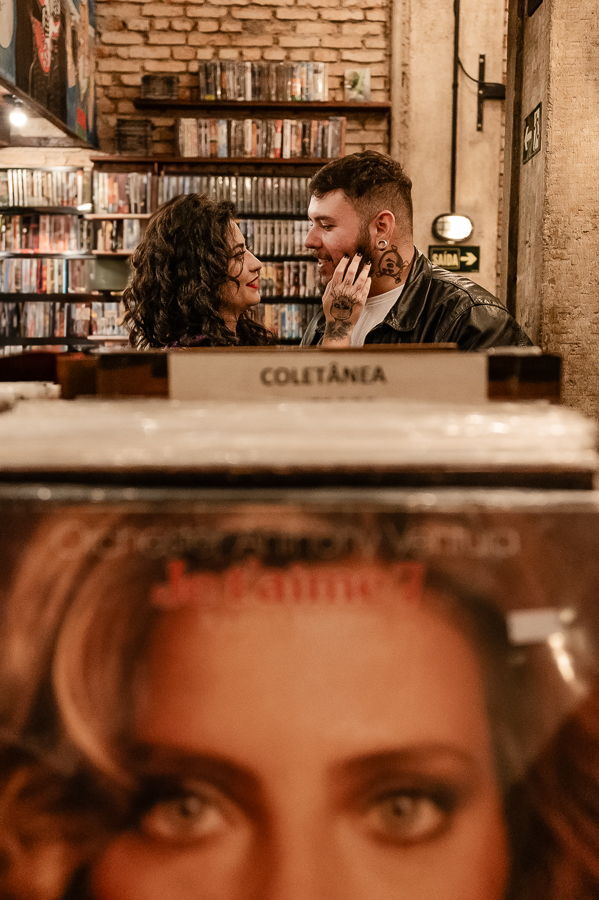 Um casal apaixonado por música, café e cultura nerd. O local escolhido pela Yasmim e pelo Ariel foi A Musical, localizado em Santos-SP, onde eles sentem-se muito a vontade, já que o ambiente é retrô, com música, discos antigos, instrumentos e, claro, café!