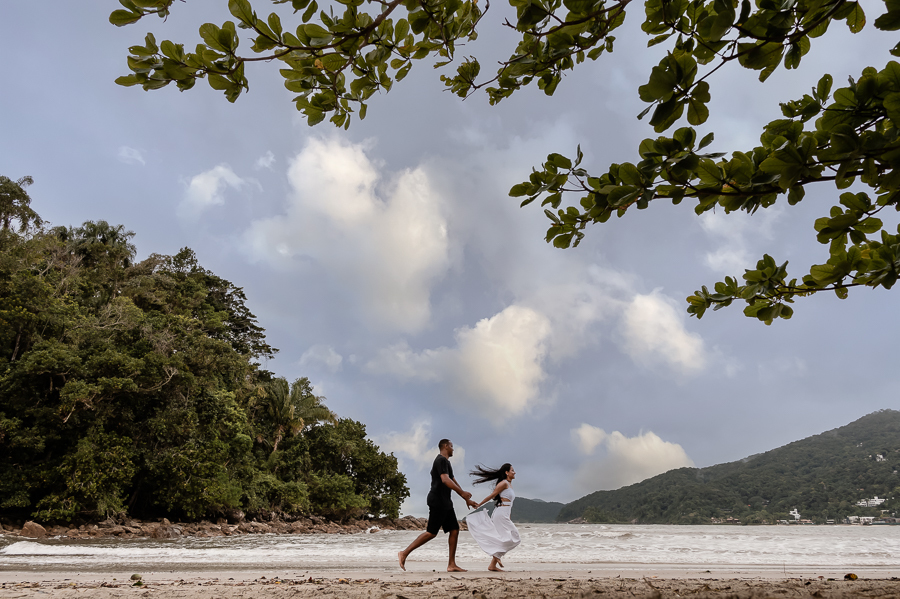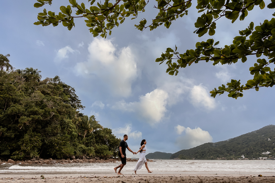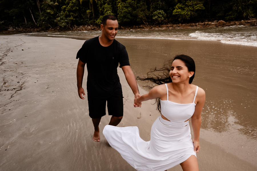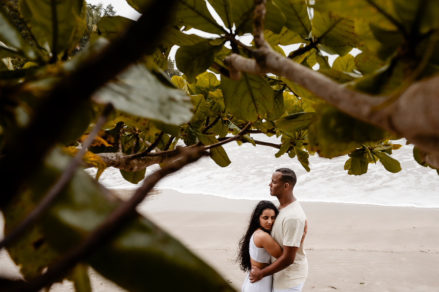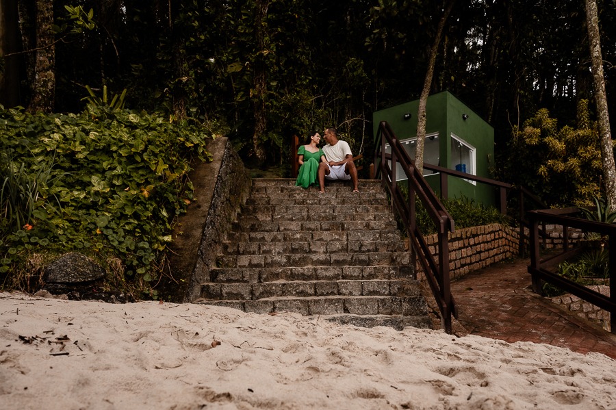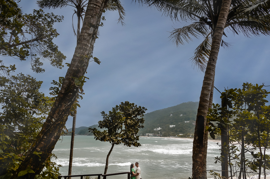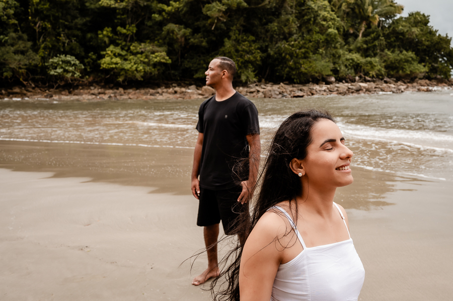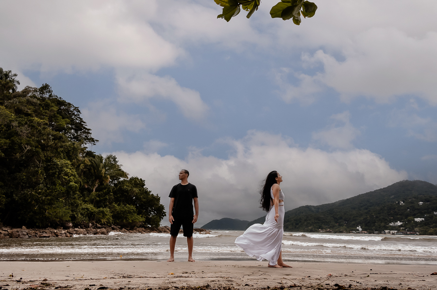 O ensaio da Victoria e do Thiago aconteceu na Praia do Iporanga, em Guarujá - SP. Os dois costumam conversar olhando o mãe, então, a escolha deles revela a conexão com a natureza.