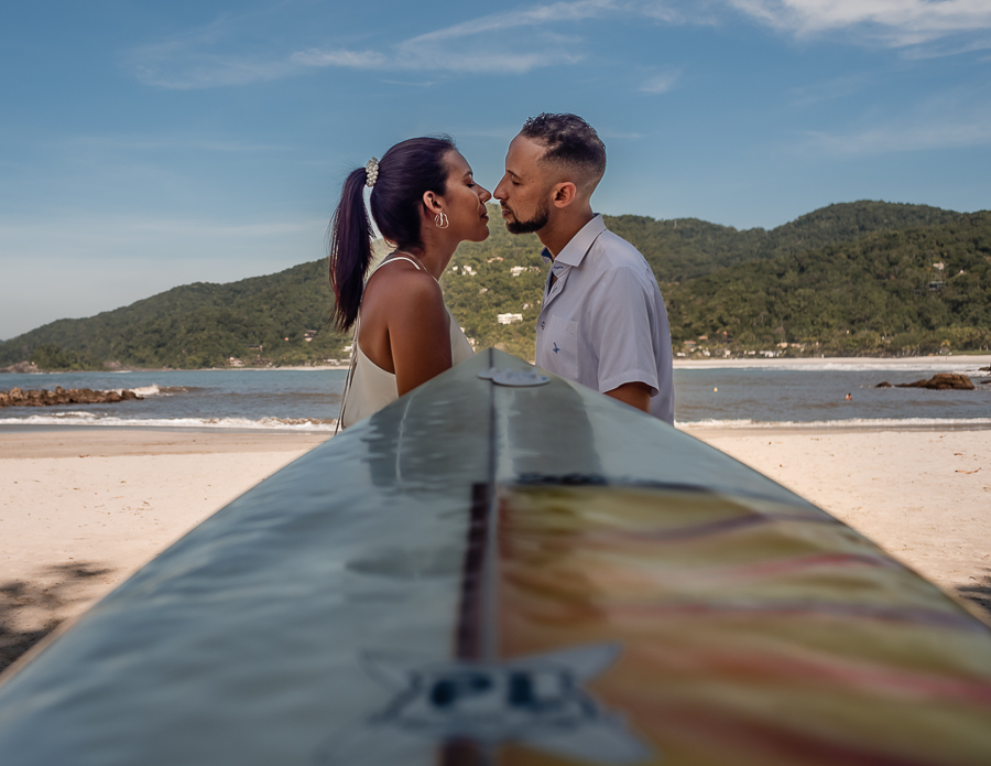 Surfista nato, o Carlos sugeriu fazer o ensaio no local que sempre pega onda em Peruíbe, mas devido a maré alta para os barcos fomos para uma outra praia no qual a Letícia gosta de frequentar e o Carlos também costuma pegar ondas, a praia de São Pedro e na praia das Conchas, na cidade de Guarujá-SP.