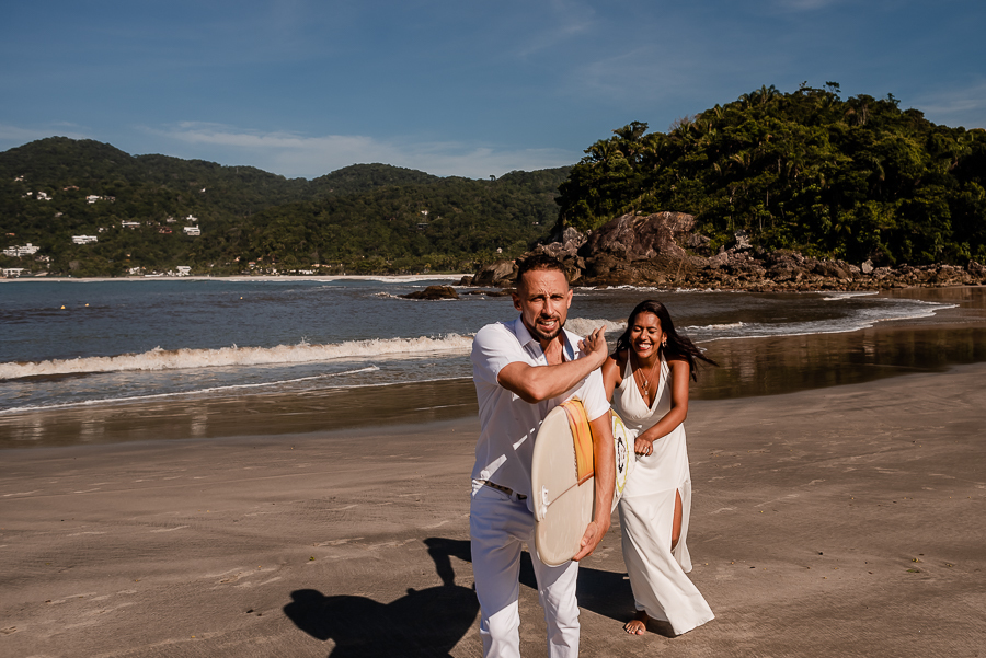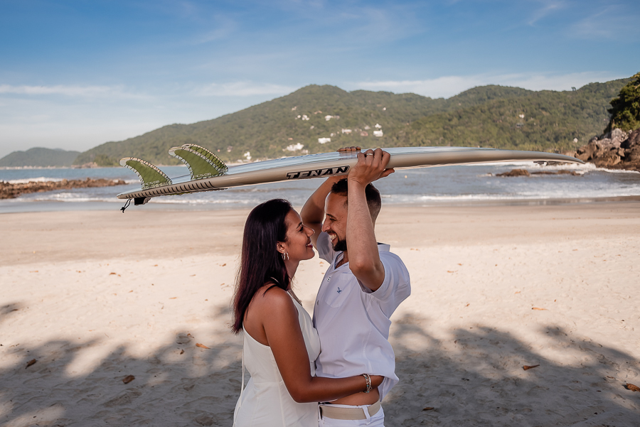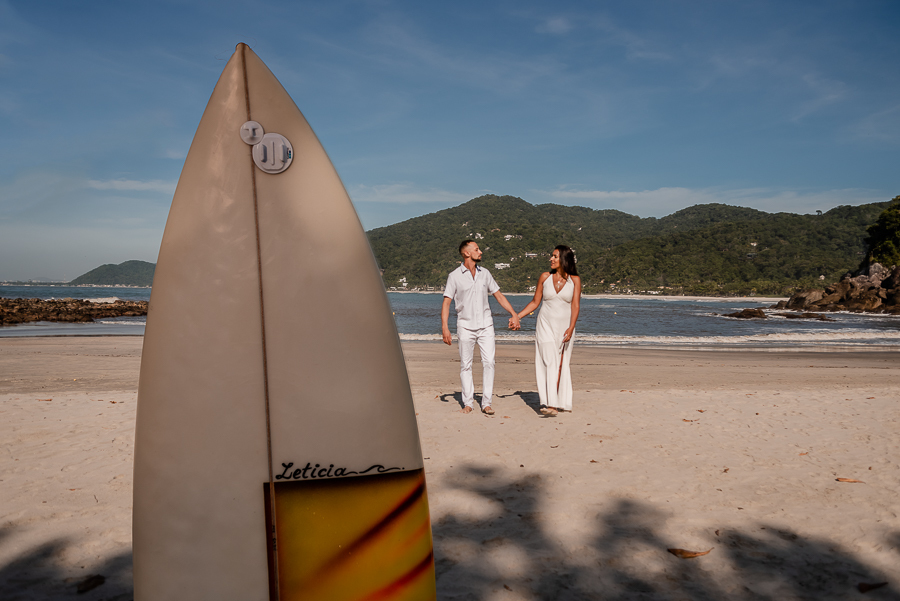 A Letícia e o Carlos aproveitaram seus momentos de conexão e brincadeiras, como a inseparável prancha com o nome da Letícia gravado nela.